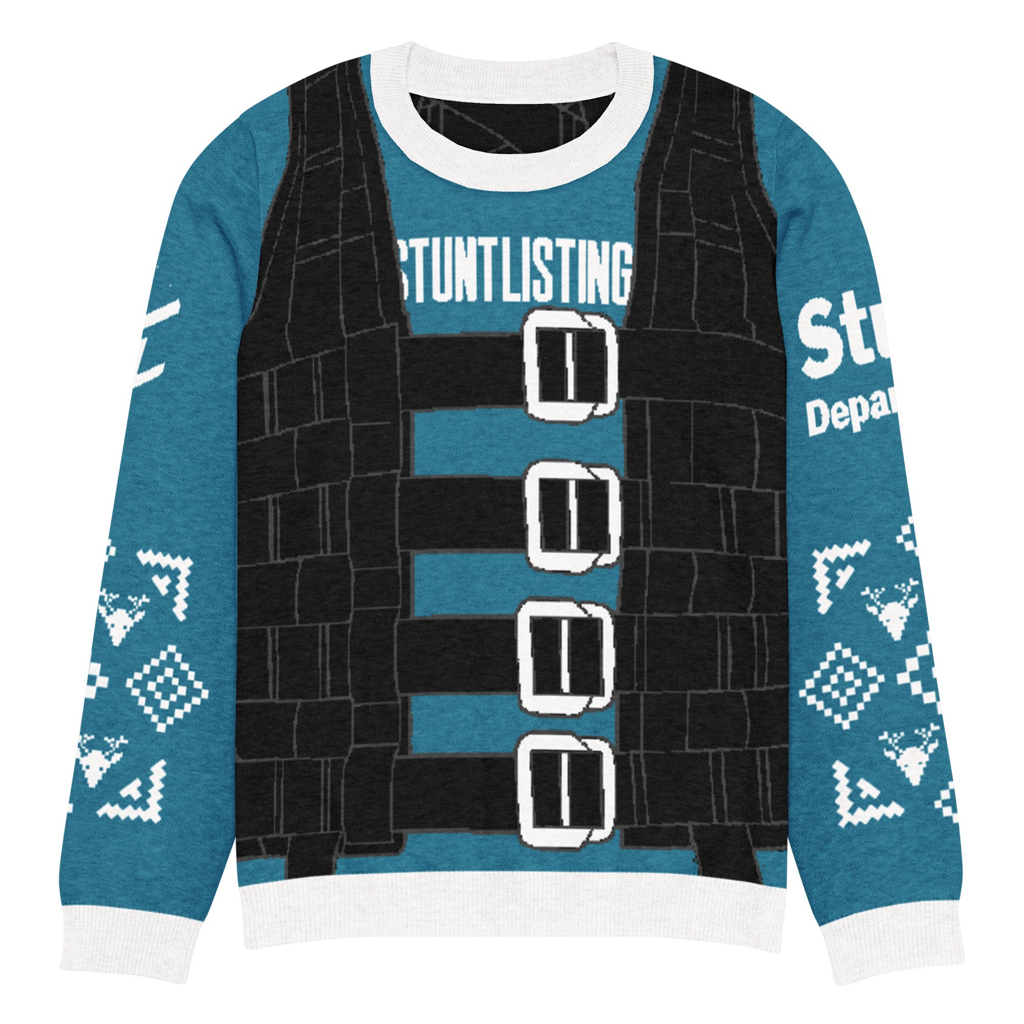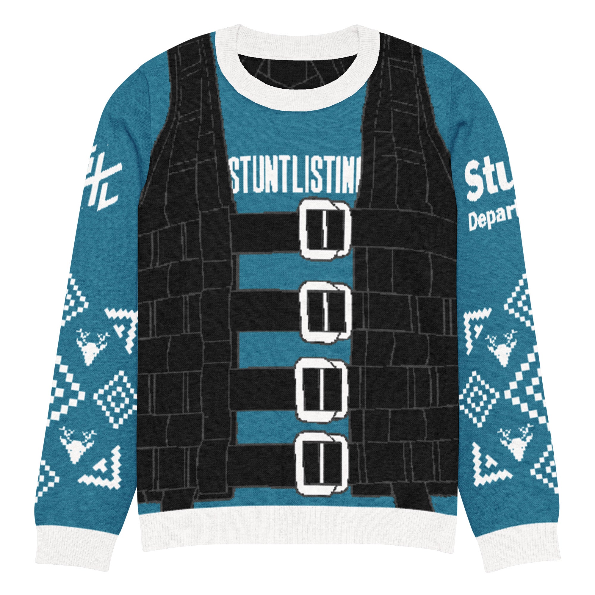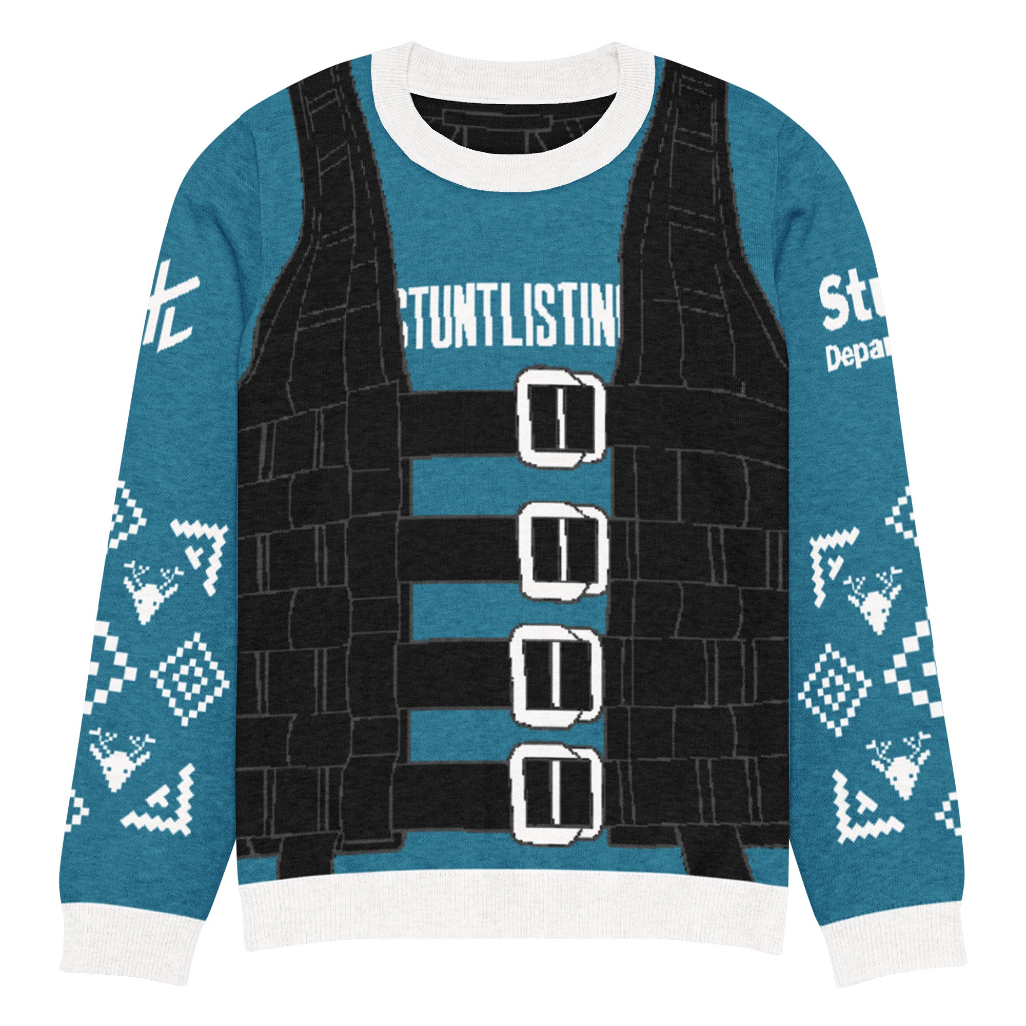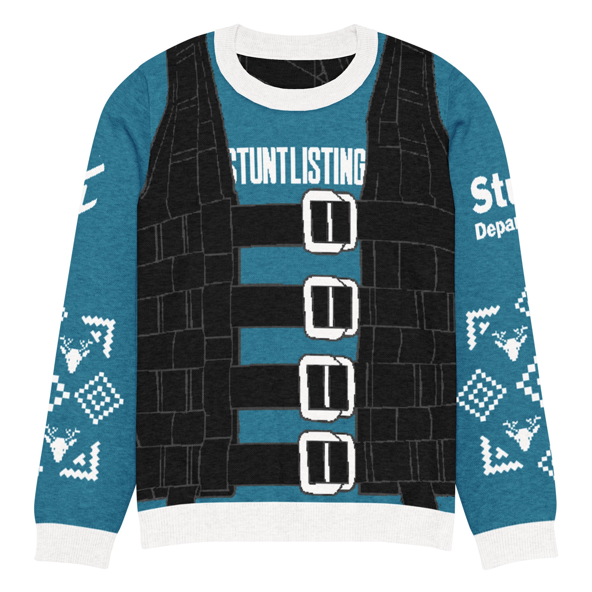 Upgrade your holiday wardrobe with the StuntListing Ugly Holiday Jerk Vest Sweater in teal and black. This cozy unisex sweater features our signature printed harness design in a fresh teal and white colorway with a sleek black vest.