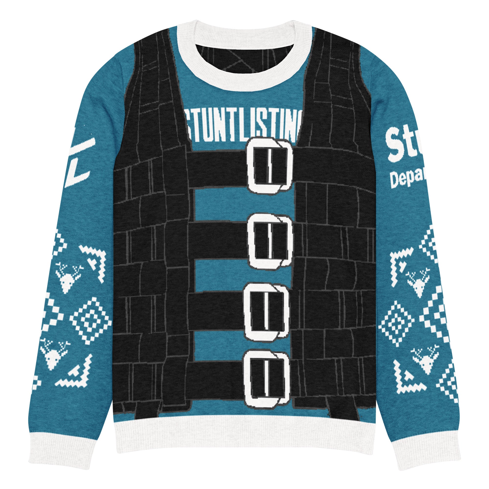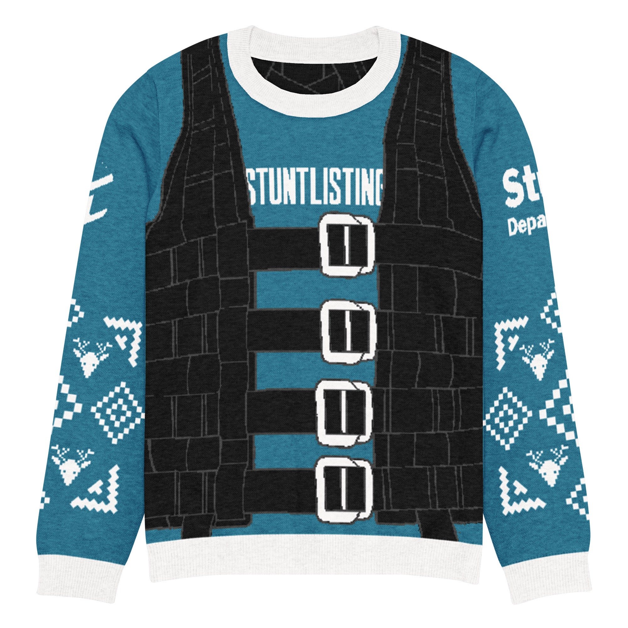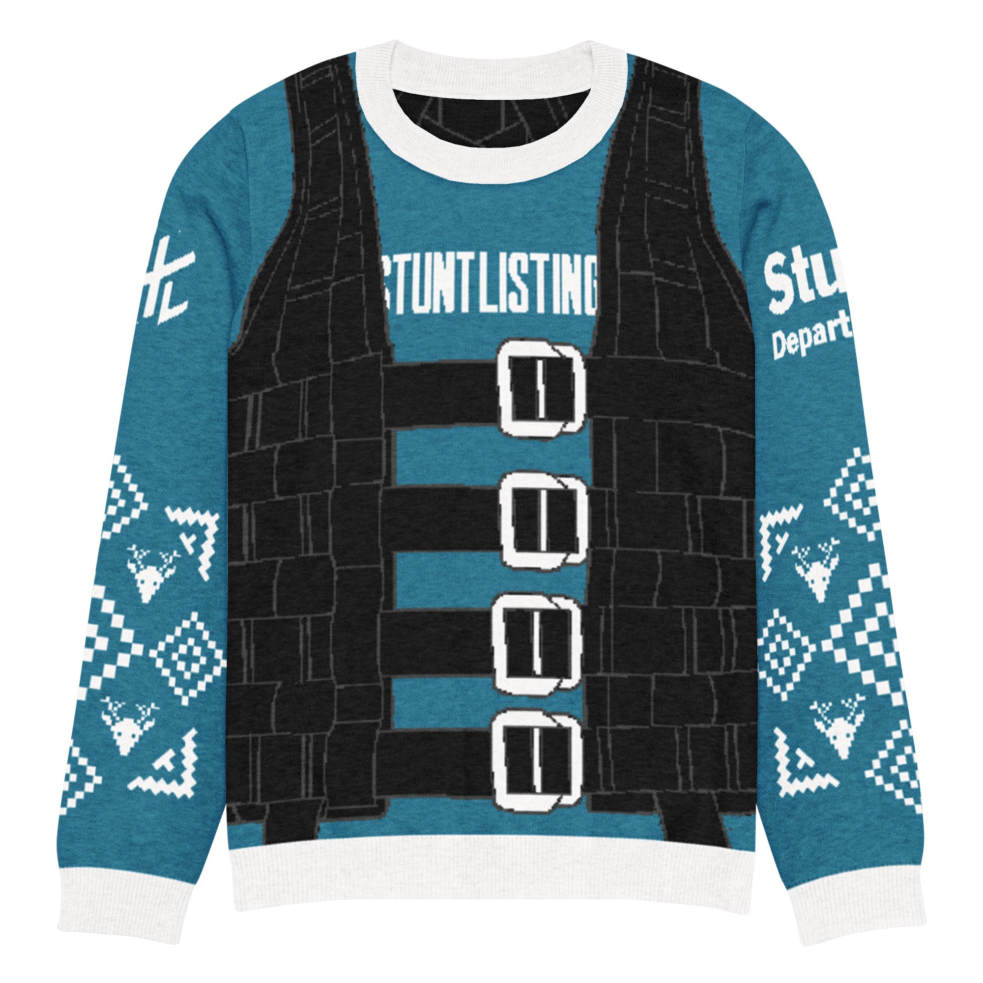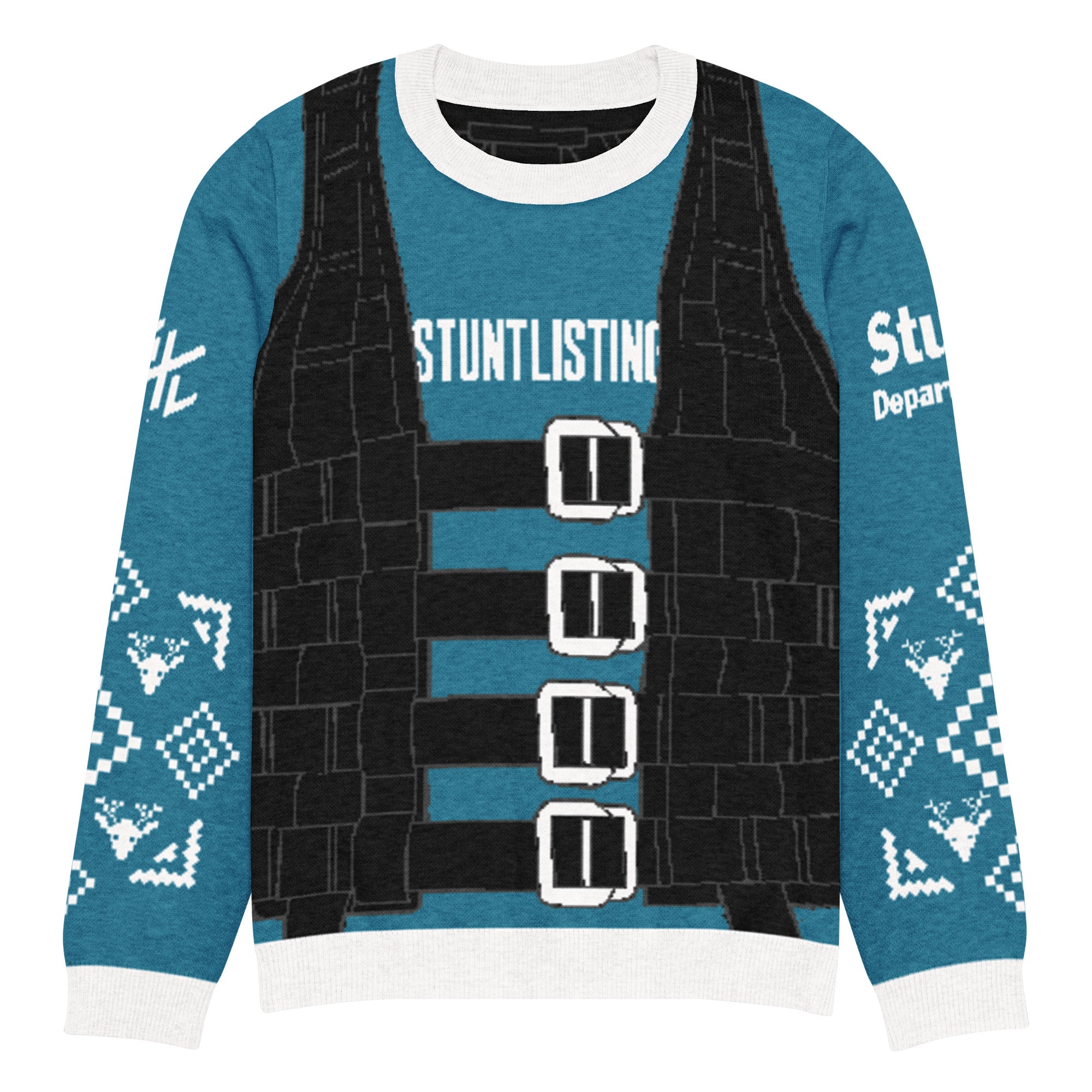 Upgrade your holiday wardrobe with the StuntListing Ugly Holiday Jerk Vest Sweater in teal and black. This cozy unisex sweater features our signature printed harness design in a fresh teal and white colorway with a sleek black vest.