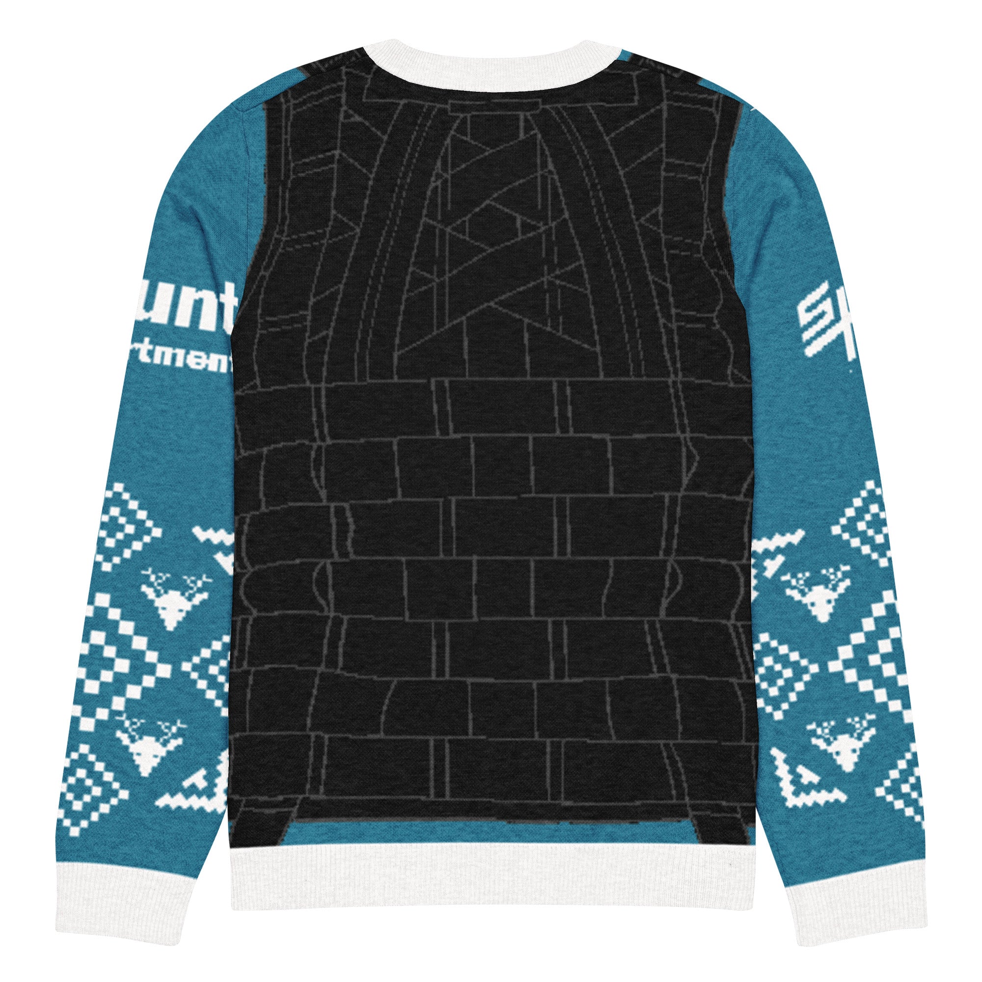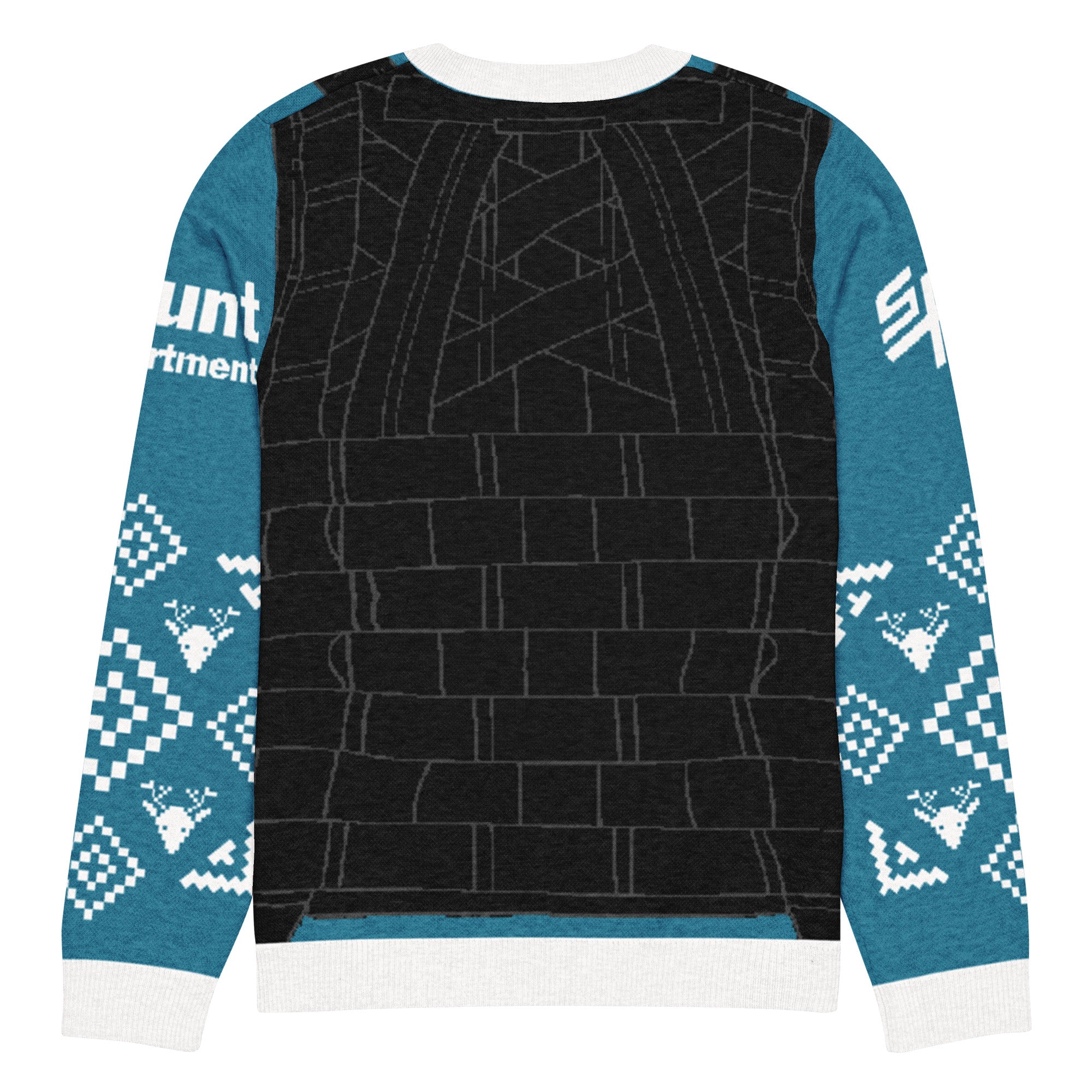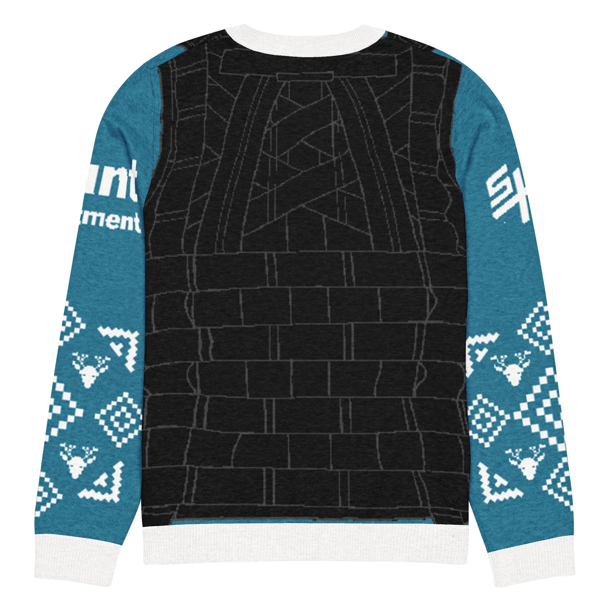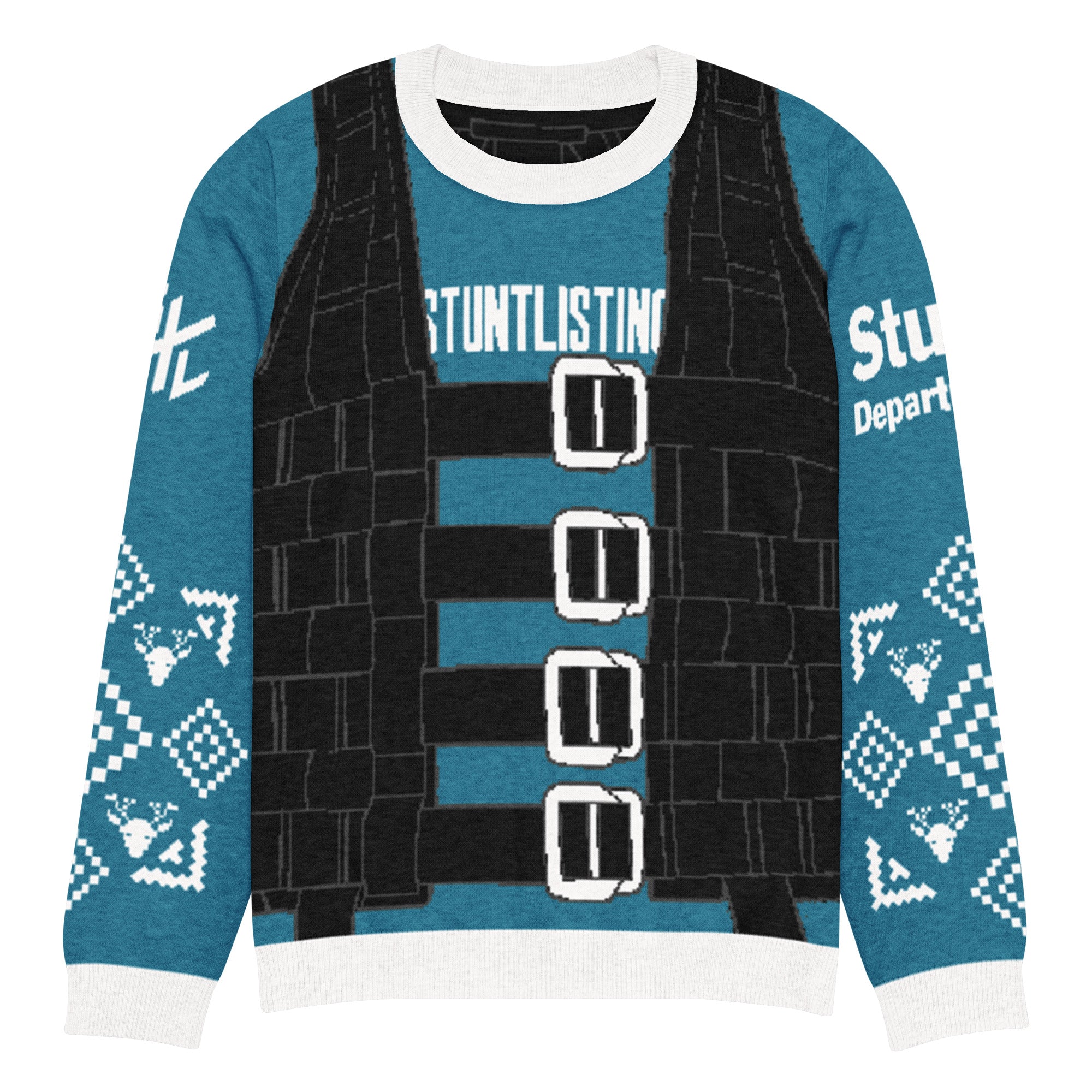 Upgrade your holiday wardrobe with the StuntListing Ugly Holiday Jerk Vest Sweater in teal and black. This cozy unisex sweater features our signature printed harness design in a fresh teal and white colorway with a sleek black vest.
