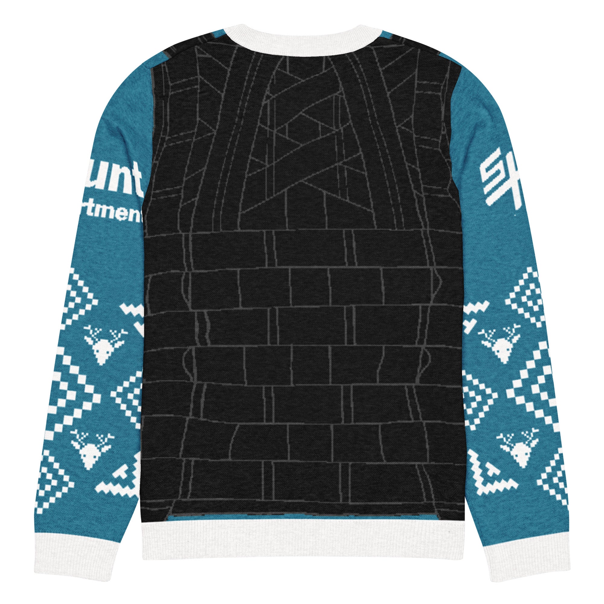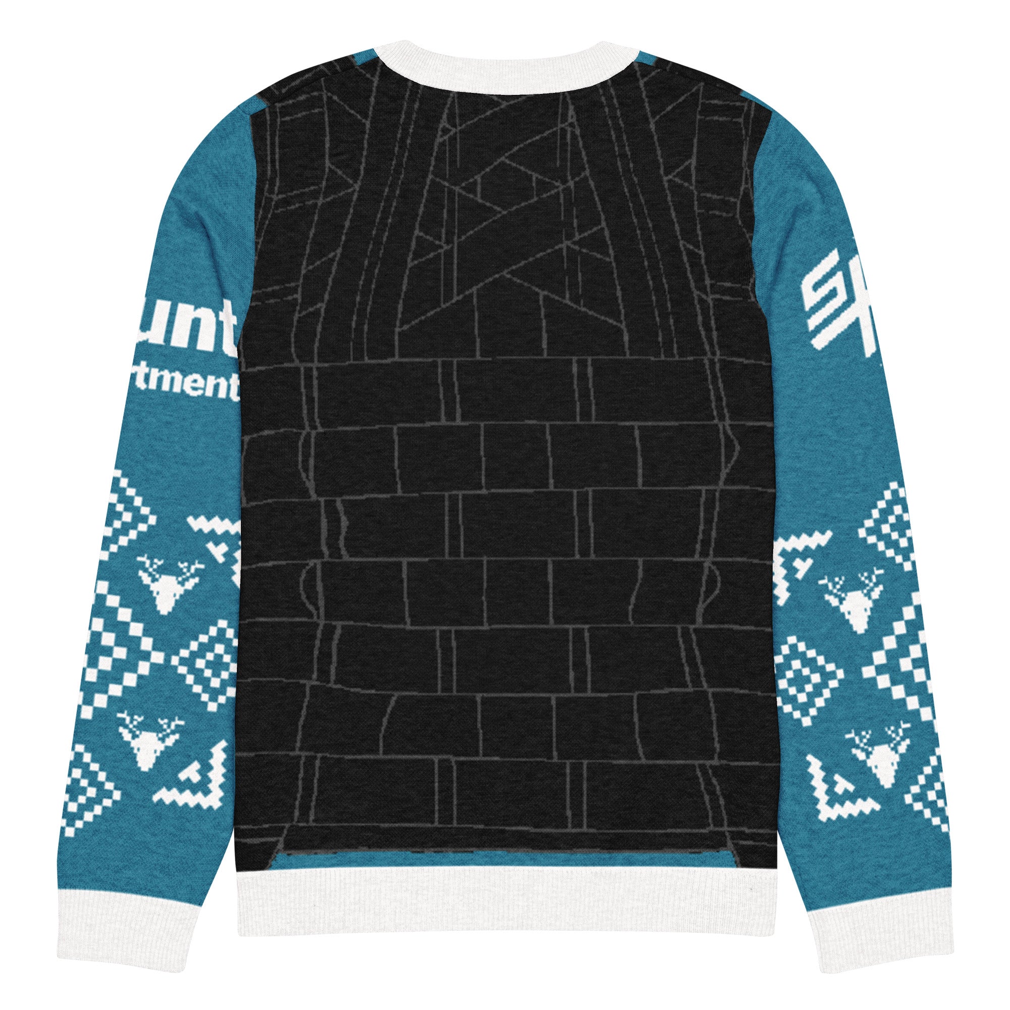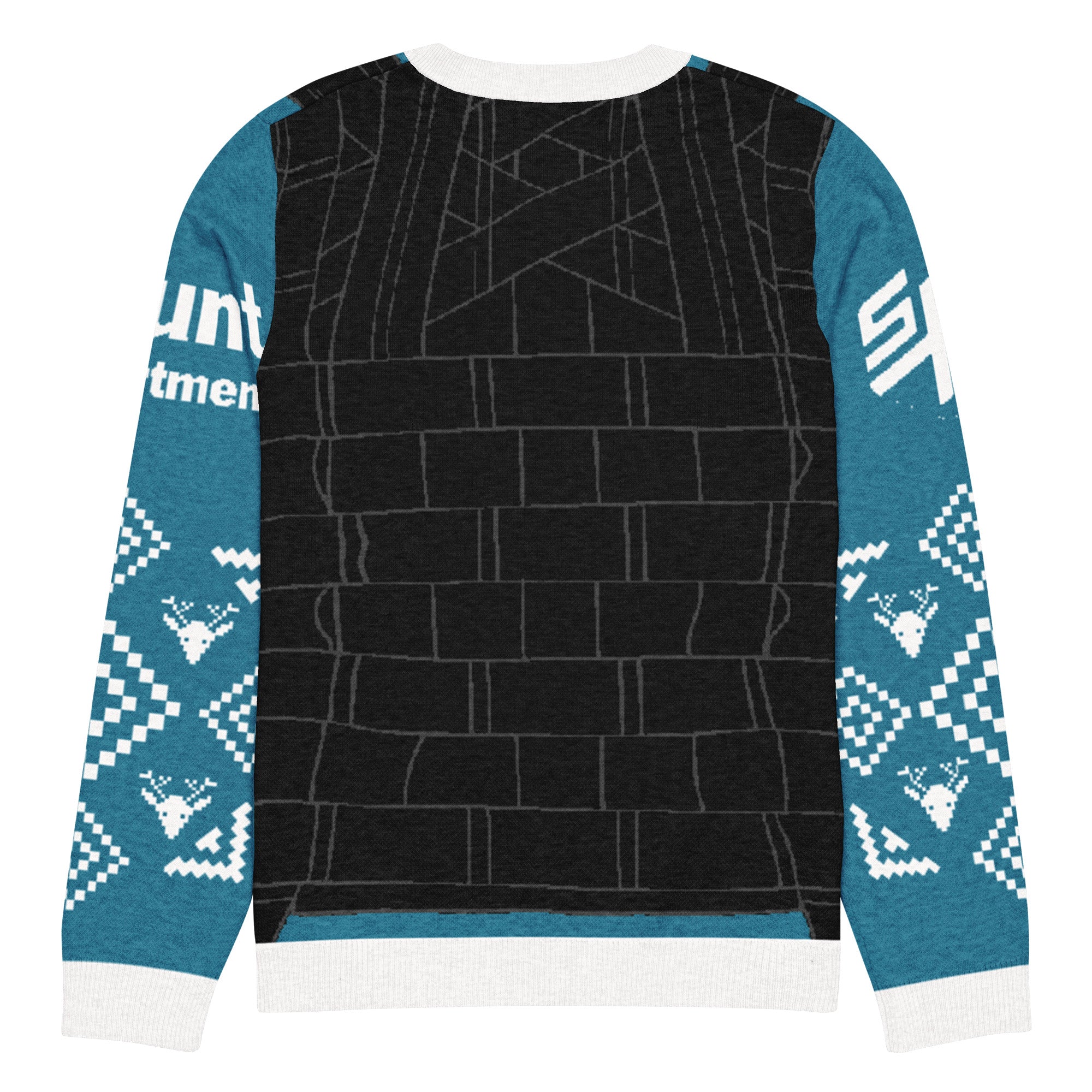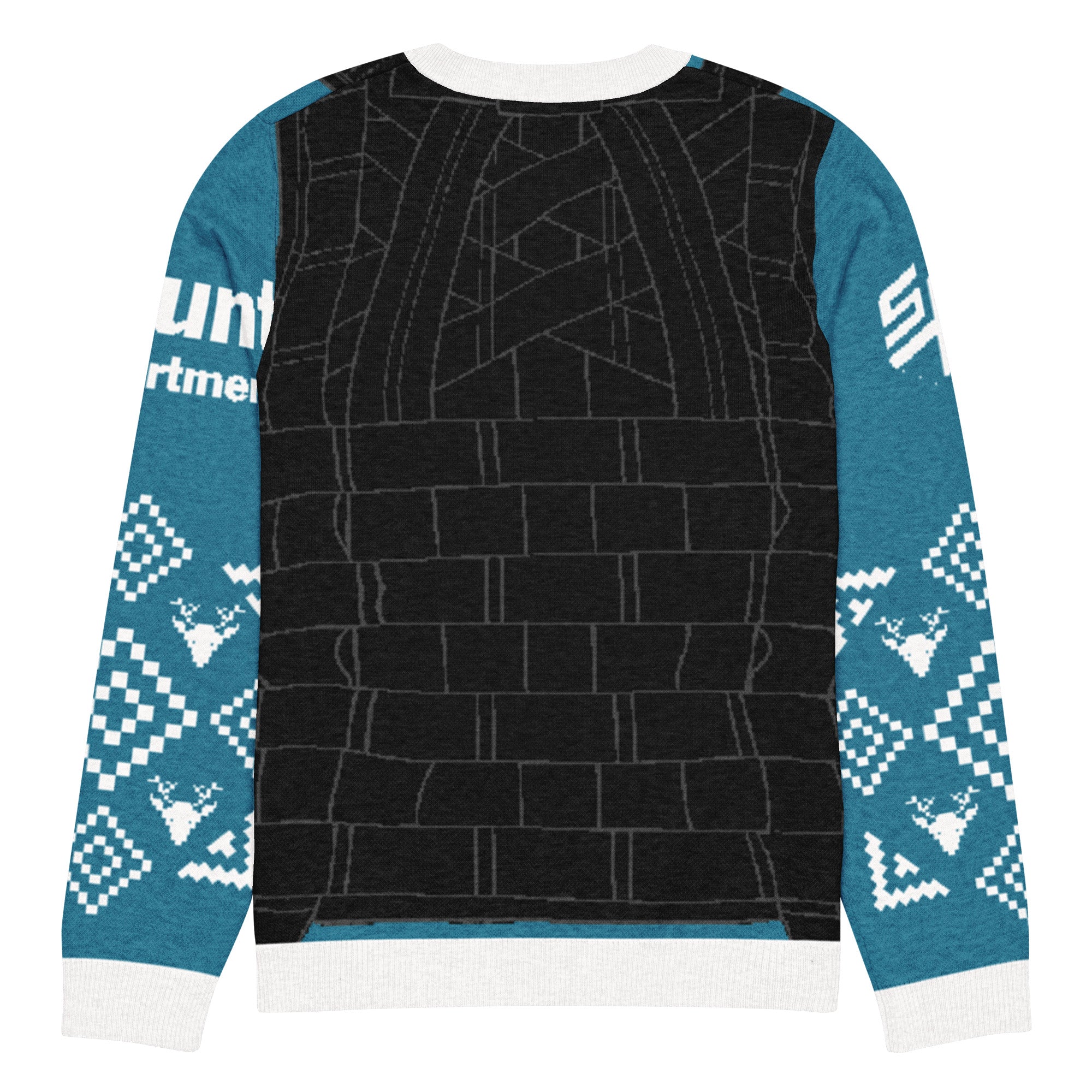 Upgrade your holiday wardrobe with the StuntListing Ugly Holiday Jerk Vest Sweater in teal and black. This cozy unisex sweater features our signature printed harness design in a fresh teal and white colorway with a sleek black vest.